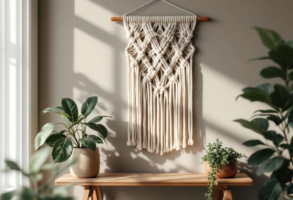 - Suspendus muraux : Utilisez de grandes pièces de macramé pour habiller vos murs. Ils apportent texture et chaleur à n’importe quelle pièce.